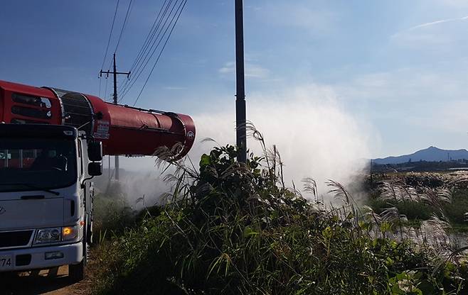 철새로 인한 AI 전파 차단 방역으로 야생조류퇴치기 31개소를 신규 설치하고, 철새도래지 10개소와 수변 3㎞ 내 가금농가 102호에는 소독차량 58대를 투입해 집중 소독을 시행 중이다.