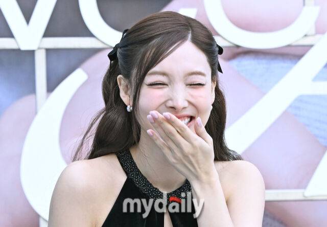 블랙 미니 원피스에 롱부츠 신은 레기룩을 선보인 나연은 취재진의 윙크 요청에 "윙크 못 해요"라며 시도했지만 두 눈을 감으며 미소를 지었다.