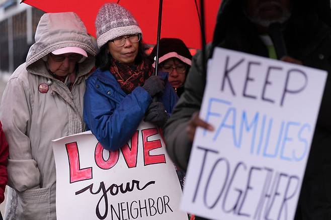 [필라델피아=AP/뉴시스] 19일(현지 시간) 미 펜실베이니아주 필라델피아에서 두 수녀가 이민세관단속국(ICE) 지부 인근에서 이민자들을 위한 기도회에 참여하고 있다. 2025.11.20.