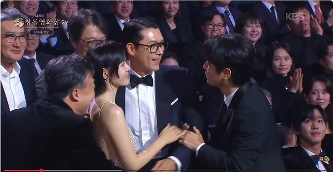 이름이 불리자마자 현빈은 예상치 못한 듯 놀란 표정을 감추지 못했다. 옆자리에 앉아 있던 아내 손예진 역시 함께 자리에서 일어나며 남편의 수상을 진심으로 축하했다.