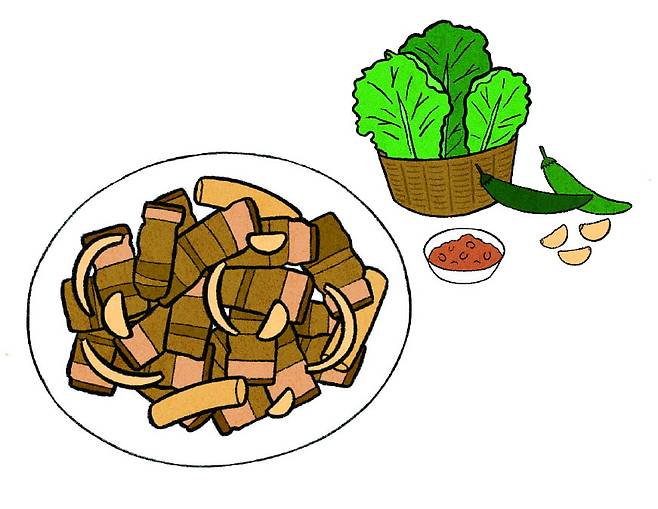 나와 동생은 당근을 싫어하지만, 카레에 들어간 당근은 잘 먹습니다. 아빠가 요리해 주 시는 고기 세트에는 고기, 마늘, 버섯, 상 추, 배추, 양배추가 있습니다. 고기와 쌈 장을 넣어 싸 먹으면 달콤하고 맛있습 니다.