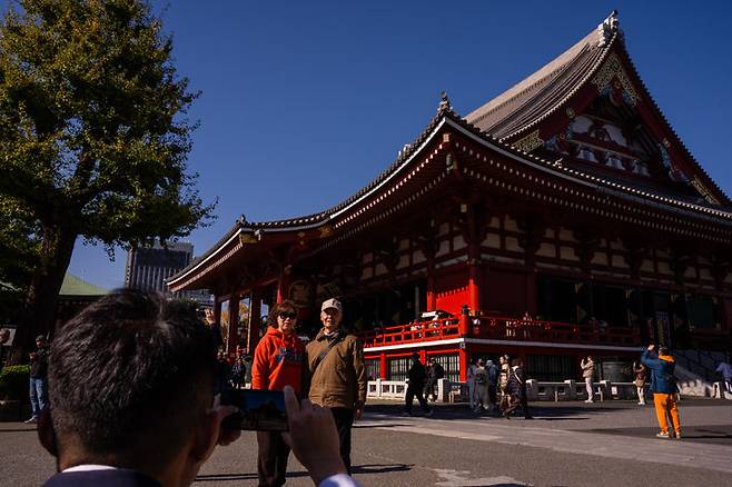 [도쿄=AP/뉴시스] 중국 문화관광부가 지난 14일부터 자국민에게 일본 여행 자제 권고 조처를 내린 가운데 20일 중국 관광객들이 일본 도쿄 아사쿠사 지역 센소지를 방문해 기념사진을 찍고 있다. 2025.11.20.