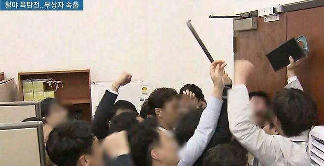 오늘 선고된 당시 자유한국당 인사들은 이 과정에서 국회 의안과 사무실과 국회 정치개혁특위·사법개혁특위 회의장을 점거하고 회의 진행을 방해한 혐의 등으로 기소됐습니다. 채이배 당시 바른미래당 의원이 회의에 참석하지 못하도록 의원실에 감금한 혐의도 추가됐습니다. 자유한국당 의원과 보좌진 27명이 무더기로 재판에 넘겨졌는데, 이들 가운데 고 장제원 전 의원은 사망으로 공소가 기각됐습니다. 검찰은 박범계 박주민 의원 등 민주당 의원과 전현직 당직자 등 10명도 공동폭행 혐의로 함께 기소했습니다.
