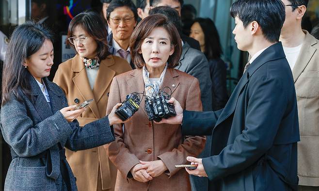 | 羅 “무죄 아닌 게 아쉽다” 국민의힘 나경원 의원이 20일 서울남부지방법원에서 열린 국회 패스트트랙 충돌 사건 선고 공판을 마친 뒤 “법원이 정치적 항거의 명분을 인정한 것”이라며 입장을 밝히고 있다. 검찰은 나 의원을 비롯한 국민의힘 현직 의원 5명에게 의원직 상실형을 구형했지만, 이날 법원의 판결로 국회의원직을 유지하게 됐다. 최상수 기자 |