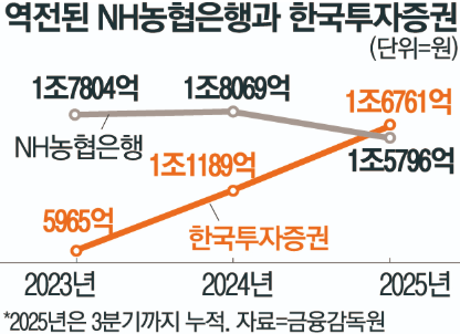 국내 증권업계 1위인 한국투자증권의 올해 3분기 누적 순이익은 5대 시중은행 가운데 한 곳인 NH농협은행의 실적을 넘어선 것으로 나타났다.