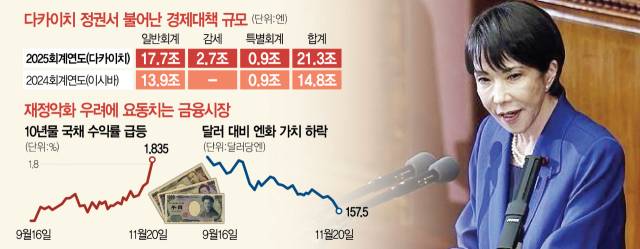 다카이치 사나에 일본 총리가 21일로 취임한 지 한 달을 맞았다. ‘강한 일본’을 전면에 내세운 속도전은 보수층과 젊은 세대를 끌어모으며 지지율 고공 행진을 가능하게 했지만 외교·경제 전반에서 균열을 보이고 있다. 최근 ‘대만 유사’ 발언을 두고 중국과의 갈등이 심화하는 가운데 21조 엔 규모의 대규모 경제정책으로 재정 악화 우려까지 겹치면서 높은 지지율을 견인한 ‘강한 일본’ 프레임이 외려 정치적 부담으로 돌아올 수 있다는 지적도 나온다.