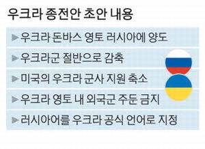 미국과 러시아가 우크라이나 동부 영토 돈바스 전체를 러시아에 양보하고, 군 규모를 절반으로 줄이는 등 러시아에 유리한 종전안 초안을 작성해 우크라이나에 전달한 것으로 알려졌다.