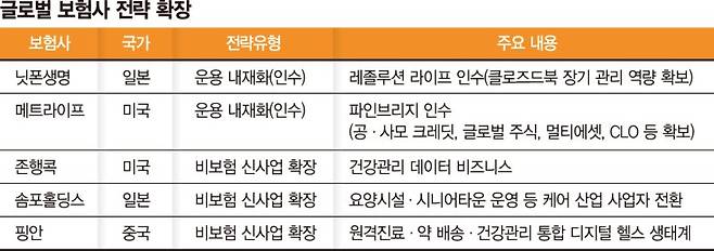 미국 보험사 존핸콕은 건강관리 데이터 기반 보험 프로그램 '바이탈리티'를 통해 보험-헬스케어 융합 모델을 구축하고 있다. 일본 손해보험사 솜포홀딩스도 요양시설·시니어타운 운영 등 케어산업을 직접 영위하는 사업자로 변신하고 있다.