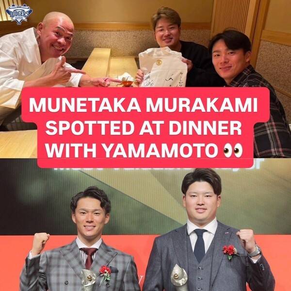 다저스네이션은 이날 야마모토와 무라카미가 함께 찍힌 사진을 공개하며 "무라카미가 그의 첫 MLB 시즌을 위해 어느 팀과 계약할지 결정 중인 가운데, 야마모토와 함께 저녁 식사를 하는 모습이 포착됐다"고 적었다.