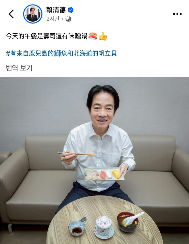 라이칭더 총통은 20일 자신의 페이스북에 사진과 함께 "오늘 점심 식사는 스시(초밥)와 미소국(일본식 된장국)"이라는 글을 올렸다. 그는 이 게시물에 '가고시마산 방어'와 '홋카이도산 가리비'라는 해시태그도 달았다.