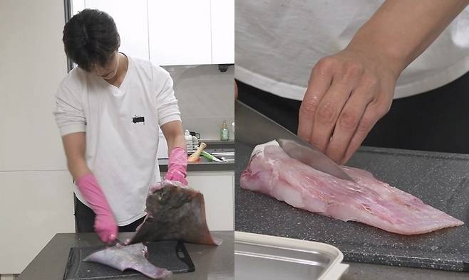 아이스박스에서 거대한 홍어를 꺼낸 박지현은 "손이 기억해부리구먼"이라며 거침 없이 손질을 시작한다.