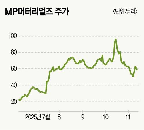미·중 무역 긴장이 완화되는 분위기가 형성되며 MP머터리얼즈 주가는 최근 한 달 사이 40% 넘게 급락했다. 인베스팅닷컴에 따르면, 지난 11월 12일(현지 시각) MP머터리얼즈 주가가 전날보다 2.2% 하락한 59.72달러를 기록했다.