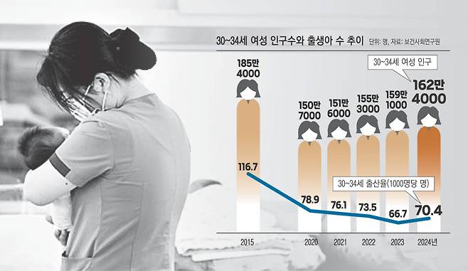 통계를 보면 전체 가임여성 인구수는 2015년 1280만명에서 2024년 1009만명으로 9년 연속 감소했다. 하지만 출산이 많이 이뤄지는 30~34세 여성 인구수는 2023년 159만1000만명을 찍고 반등해 지난해 162만4000명까지 늘었다. 이 연령대의 출산율은 2023년 1000명당 66.7명에서 지난해 70.4명으로 반등했다. 즉, 전체 가임여성이 줄어드는 구조 속에서도 유일하게 인구가 늘어난 30대 초반 여성 집단이 지난해 출생아 수 반등의 핵심 요인이라는 것이다.