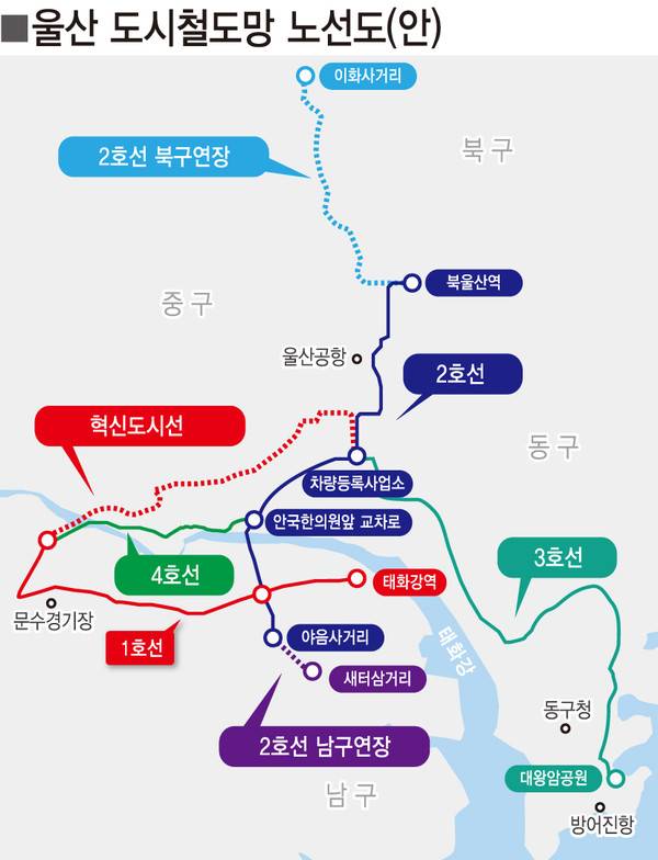 울산시는 기존 도시철도 2·3·4호선 노선을 재검토하고, 2호선 연장과 혁신도시선을 포함한 도시철도망 계획을 새로 마련했다고 20일 밝혔다.