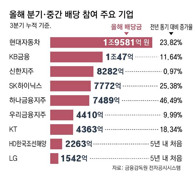 SK하이닉스와 현대모비스도 배당 확대 행렬에 동참했다. 9월 기준 SK하이닉스는 누적 7772억 원을 배당해 전년 동기 대비 25.4% 늘렸으며 현대모비스도 1339억 원을 배당해 전년 대비 48.7% 증가시켰다. 올해 처음으로 중간 배당을 실시한 포스코인터내셔널(1449억 원·중간배당) 등 2021년 이후 새롭게 분기·중간배당에 나선 기업도 35개사에 달한다.