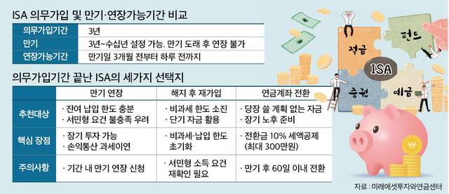 우선 ISA의 의무가입기간과 만기는 다른 개념이다. 의무가입기간은 3년이지만, 만기는 3년부터 수십년까지 자유롭게 설정할 수 있다. 의무가입기간만 지나면 중도해지를 해도 비과세·저율과세 혜택은 유지된다. 만기 연장은 만기일 기준 3개월 전부터 하루 전까지 가능하며 만기 도래 후에는 연장이 불가하므로 유의해야 한다.