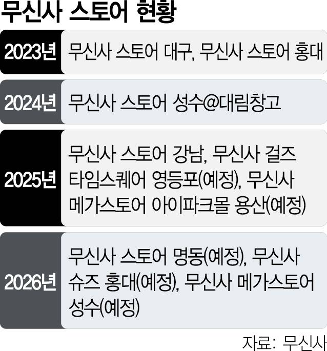20일 업계에 따르면 무신사는 다음달 서울 영등포 타임스퀘어와 용산 아이파크몰에 각각 ‘무신사 걸즈’와 ‘무신사 메가스토어’를 오픈한다. 내년 1월에는 서울 명동과 홍대에 각각 ‘무신사 스토어 명동’과 ‘무신사 슈즈 홍대’를, 내년 상반기에는 성수동에 ‘무신사 메가스토어 성수’도 문을 열 예정이다.