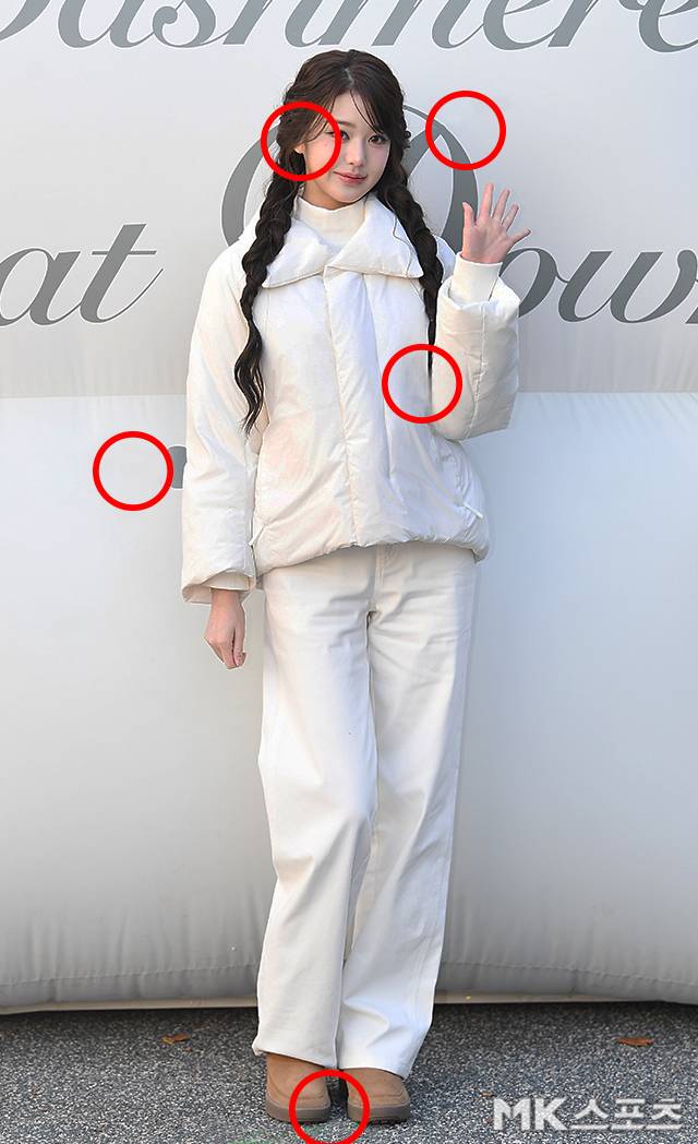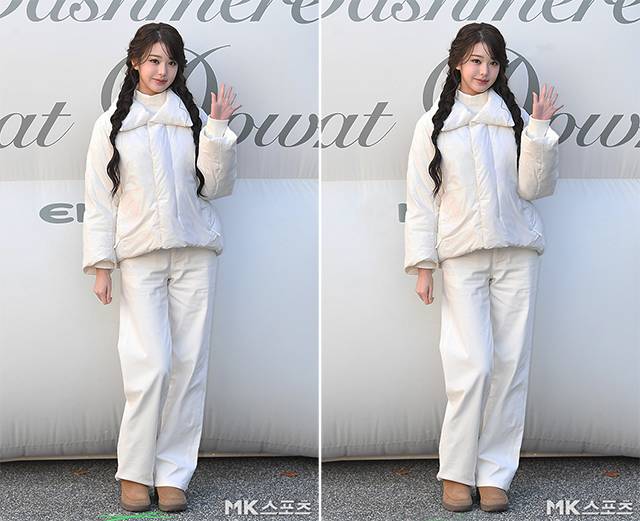 이날 행사에서 머리를 양쪽으로 길게 땋은 장원영은 화이트 터틀넥에 화이트 방한 재킷, 그리고 화이트 팬츠를 매치해 올화이트 패션을 선보였습니다.