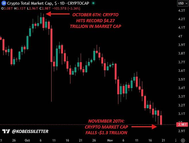 펀드스트랫의 톰 리 설립자는 ″암호화폐 시장은 10월 10일 이후 부진하다. 그날 부정적 충격이 있었기 때문이다. 지난 몇 주 암호화폐 시장의 하락세는 그런 충격을 반영한다고 생각한다. 2022년에는 그런 현상이 완전히 해소되는 데 8주가 걸렸다. 이제 겨우 6주째다. 암호화폐, 비트코인, 이더리움은 이러한 부진과 유동성 약화로 인해 어떤 면에서는 주식 시장의 선행 지표라고 생각한다"라고 말했습니다.