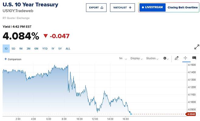 뉴욕 채권 시장에서 채권 금리는 내림세를 보였습니다. 오후 4시40분께 10년물 수익률은 4.8bp 떨어진 4.084%, 2년물은 6.3bp 내린 3.535%를 기록했습니다. 9월 고용에서 실업률이 하락한 영향이 있었고요. 증시가 급락하면서 '안전자산' 매수 수요도 몰렸습니다.