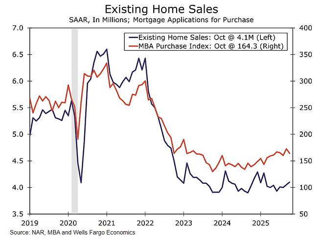 10월 기존주택 판매는 1.2% 증가한 연율 410만 채를 기록하며 두 달 연속 상승세를 보였습니다. 역사적 기준에 비해 여전히 저조하지만, 최근 몇 달 동안 주택 담보 대출 금리가 완만하게 완화되면서 거래량이 증가세를 보입니다.