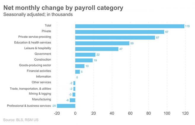 11만9000개 일자리가 어디서 생겼는지 보면 ▲헬스케어 4만3000개 ▲식음료서비스 3만7000개 ▲사회복지 1만4000개 등 대부분 경기를 타지 않거나 저임금 직종에서 발생했습니다. 운송창고업에서는 2만5000개 감소했는데요. 통상 운송창고업에서 대규모 감소는 경기 침체 징후로 풀이되죠. 전문직·사업서비스에서도 2만 개가 사라졌습니다. 광업, 건설, 제조업 등에선 별다른 변화가 없었습니다. 저임금 업종 중심의 일자리 증가는 시간당 평균 임금이 전월 대비 0.2%, 전년 대비 3.8% 상승에 그친 이유일 수 있습니다.