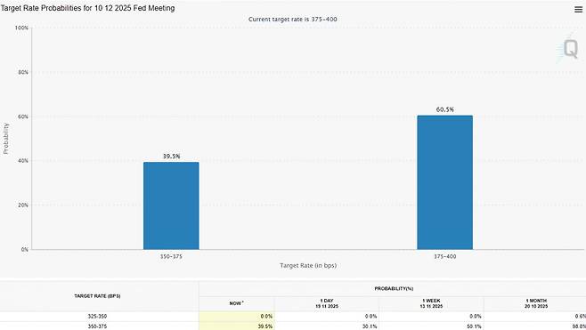 시카고상품거래소(CME)의 Fed워치 시장에서는 12월 금리 인하 기대가 어제 30%에서 9월 고용 발표 이후 39%까지 높아졌습니다. 하지만 여전히 50% 이하입니다.