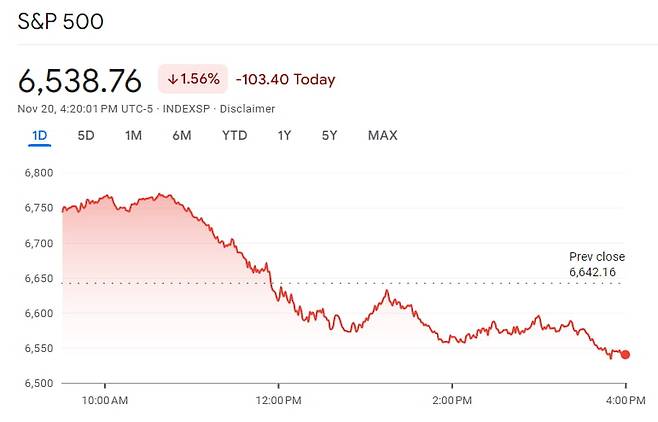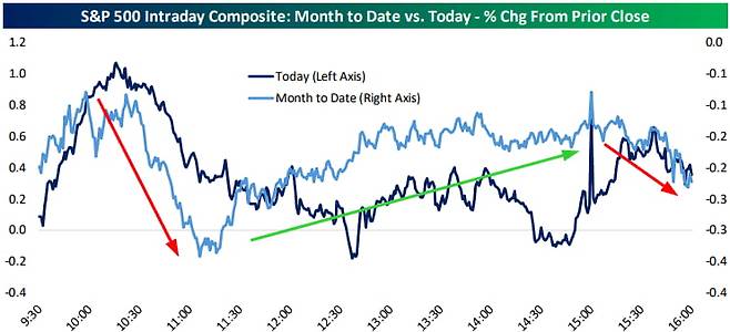 문제는 이런 아침 10시 비트코인 내림세가 AI 주식 등으로 전염되고 있다는 겁니다. 어제도 아침 10시가 좀 넘으면서 주가 상승세가 확연히 꺾였고요. 오늘도 비슷합니다. 그래서 비스포크인베스트먼트는 오늘 아침 10시를 주목하라는 보고서를 냈습니다. 비스포크는 "최근 오전 10시~11시가 힘들다고 느낄 수 있다. 실제 11월 들어 현재까지 S&P500 지수는 오전 10시 대에 급락한다. 오늘 그런 추세가 깨질지, 아니면 오전 10시 알고리즘이 여전히 덤프(투매)에 나설지 지켜보겠다"라고 했었습니다.