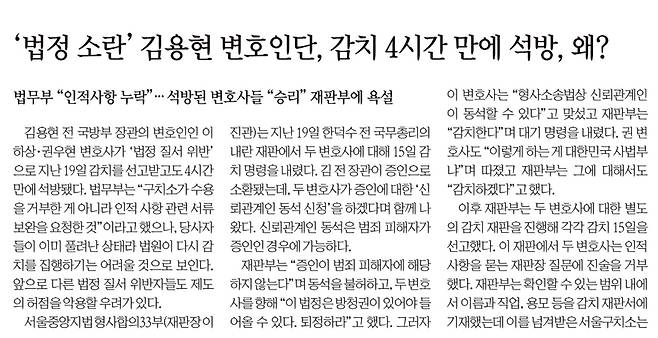 김용현 전 국방부 장관의 변호사들이 19일 한덕수 전 국무총리의 재판 도중 법정 질서 위반으로 판사로부터 감치명령을 받았다가 4시간 만에 석방되는 일이 생겼다.