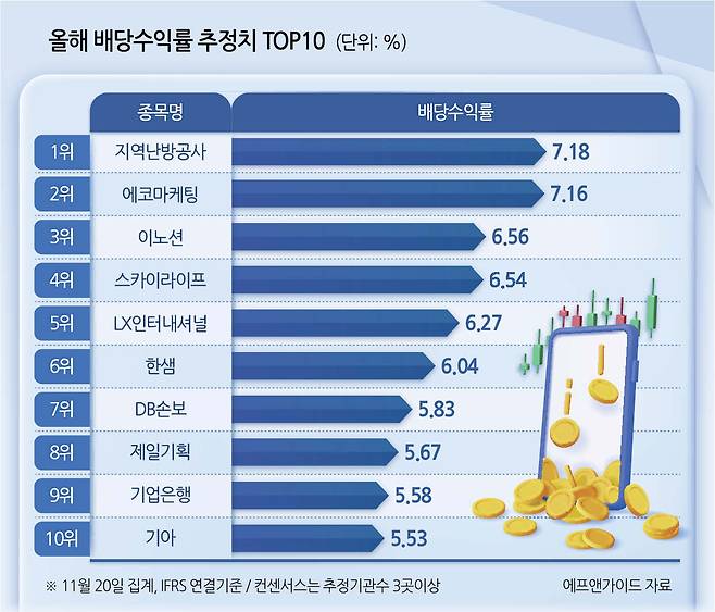 21일 에프앤가이드에 따르면, 20일 기준으로 올해 상장사 배당수익률 추정치 1위 종목은 지역난방공사(7.18%)인 것으로 나타났다. 그 뒤로 에코마케팅(7.16%), 이노션(6.56%), 스카이라이프(6.54%), LX인터내셔널(6.27%) 등의 순이다. 배당수익률 상위 20개 종목 중 18개 종목의 추정 배당수익률이 5%를 웃돌았다.