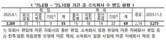 대기업집단 92곳의 소속 회사는 지난 8월 1일 기준 3289개에서 11월 3일 기준 3275개로 14개 감소했다.