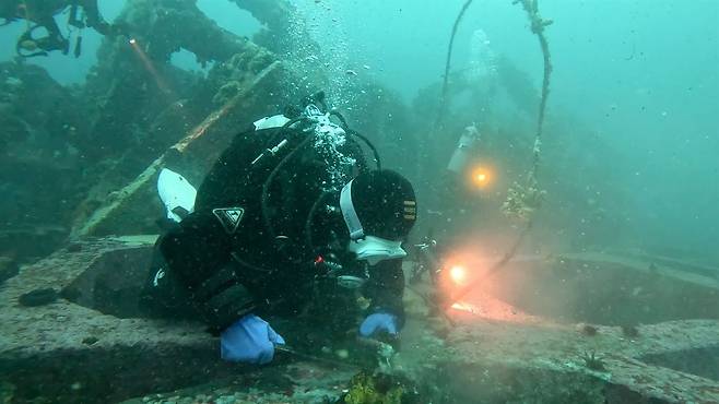 서: "2020년도 태풍 마이삭 때 쓸려왔던 폐기물이 아직도 수거가 다 안됐어요. 바닷속에 노란 박스가 2천 개 정도 가라앉았는데 절반 넘게 남아있어요. 꾸준히 작업하고 있어요. 쓰레기를 결속해 부양백을 매달아 띄어 올리거나 육상에서 크레인으로 끌어당겨요. 어망, 통발, 폐어구들도 많아요. 어민, 자원봉사자들과 함께 이제까지 8만kg 해양폐기물을 수거했어요. 해양정화활동하는 시민단체들이 처리하는 양이 늘어나고 있지만, 발생량에 비하면 아직 턱없이 부족하죠. 우리나라 연간 해양폐기물양이 14.5만t이나 돼요."