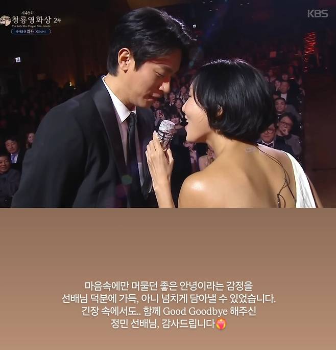 화사는 21일 자신의 계정에 "마음속에만 머물던 좋은 안녕이라는 감정을 선배님 덕분에 가득, 아니 넘치게 담아낼 수 있었습니다. 긴장 속에서도 함께 Good Goodbye 해주신 정민 선배님, 감사드립니다"라는 글과 함께 청룡영화상 공연 장면을 캡처한 사진을 올렸다.