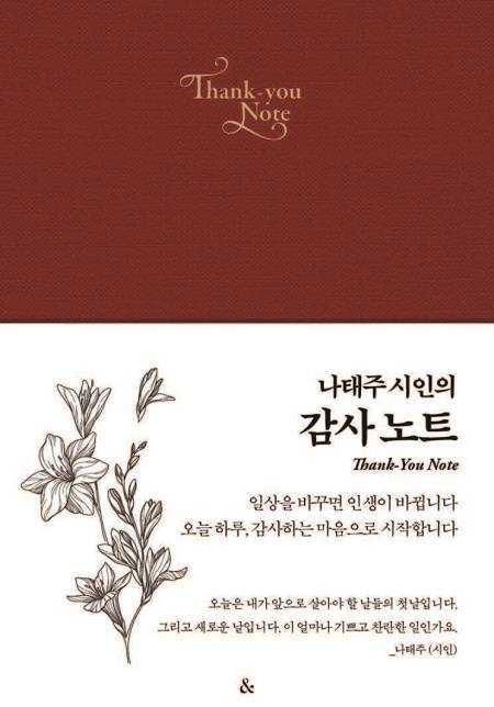 시인 나태주가 ‘감사 노트’를 통해 일상의 감사를 기록하는 법을 건넨다. 그는 오랜 병원 생활을 마치고 퇴원한 후에 “무엇 하나 감사하지 않은 것, 눈물겹지 않은 것이 없다”고 말한다. 시인의 어록과 깊은 생각을 담아 독자가 직접 ‘오늘 감사했던 일’을 일기처럼 기록할 수 있는 여백으로 이뤄져 있다. 햇살, 꽃, 집 같은 일상 속 사소한 대상에서도 감사의 이유를 찾는 저자의 시선이 고스란히 담겼다.