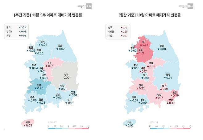 경기·인천과 수도권도 각각 -0.01%, -0.03% 하락했다. 전국 17개 시도 기준 상승 2곳, 보합 1곳, 하락 14곳으로 하락 지역이 대부분이다. 지역별로 △전북(-0.25%) △전남(-0.08%) △강원(-0.07%) △인천(-0.06%) △광주(-0.06%) 등이 떨어졌다. 제주와 충북은 각각 0.03%, 0.01% 올랐다.