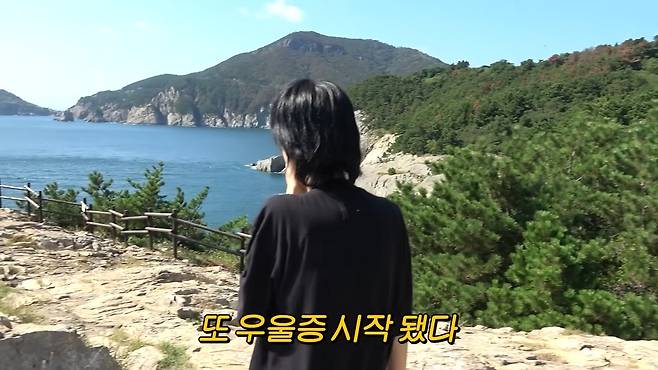 영상 속 홍진경은 우여곡절 끝에 욕지도에 도착해 출렁다리로 향했다. 출렁다리를 지나던 중 고명환은 바위틈 사이에 자라는 소나무를 가리키며 "내가 올 때마다 얘한테 맨날 인사한다"고 설명했다. 주변 풍경을 둘러보던 홍진경은 "여기 뭐냐"며 감탄을 이어갔으나 곧 "나 좀 혼자 있겠다"고 말한 뒤 갑자기 눈물을 터뜨렸다. 제작진은 이 장면에 "우울증 또 시작됐다"는 자막을 달았다.