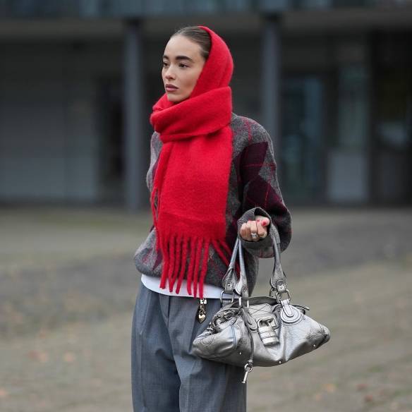 한파에 맞서는 가장 패셔너블한 방법 중 하나가 바로 머플러로 얼굴까지 감싸는 거죠 . 추운 날씨에도 스타일에 있어서는 한 발짝도 물러날 수 없다는 걸 보여주는 거죠. 그레이 톤 니트와 팬츠에는 특별히 강렬한 레드 머플러 를 둘러주면 좋습니다. 그 어떤 아우터보다도 더 드라마틱한 실루엣을 만들어낼 수 있거든요.