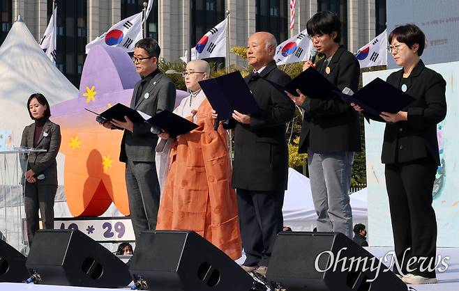 | ▲ 10.29 이태원 참사 3주기 기억식이 지난 10월 29일 오전 서울 종로구 광화문광장에서 열렸다. 이태원 참사 시민대책회의의 공동선언문이 낭독되고 있다. |
