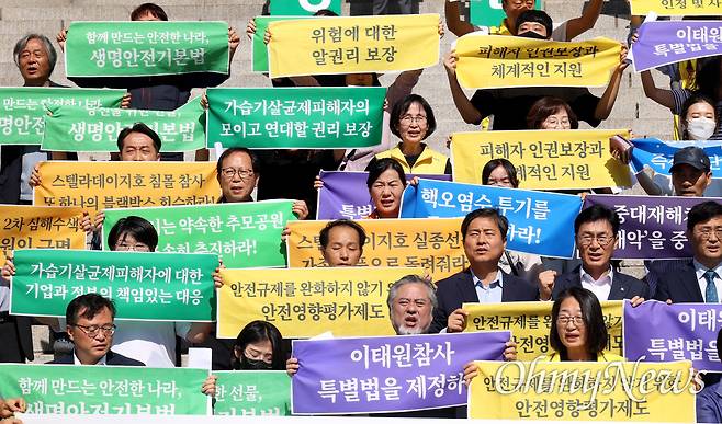 | ▲ 생명안전기본법 제정을 위한 국회 국민동의청원이 진행 중이던 2023년 9월 7일, 사회적참사 유가족들과 생명안전 분야 시민단체, 각 정당 국회의원들이 국회 본관 앞에서 기자회견을 열어 생명안전 의제를 최우선으로 논의하는 국회가 되어야 한다고 촉구하고 있다. |