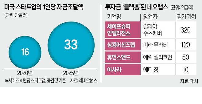 AI 핵심 인재를 보유한 스타트업들은 ‘네오랩스’라는 새로운 명칭까지 얻으며 승승장구하고 있다. 오픈AI 공동 창업자 중 한 명인 일리야 수츠케버(사진)가 창업한 세이프슈퍼인텔리전스는 창업 1년 만에 320억달러(약 47조원) 가치로 평가받고 있다. 직원은 지난 7월 기준 50명 내외에 불과한 것으로 알려졌다. 고용 데이터 기업 레비오랩스에 따르면 시리즈A 투자를 받은 스타트업의 직원 1인당 조달 자금 중간값은 2020년 16만달러에서 올해 33만달러로 두 배 이상으로 늘었다.