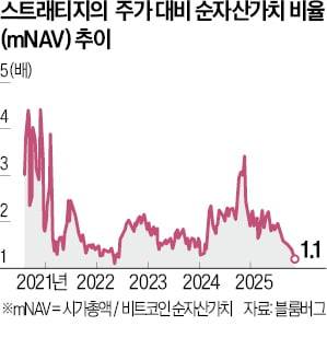 문제는 올 들어 비트코인 가격보다 스트래티지의 주가가 더 빠른 속도로 떨어졌다는 점이다. 올 들어 나스닥시장에서 스트래티지는 41%가량(20일 기준) 하락했는데, 이는 비트코인 하락폭(8%)보다 훨씬 크다. 이는 회사의 시가총액을 비트코인 순자산가치(NAV)로 나눈 주가 대비 순자산가치 비율(mNAV)을 크게 낮췄다. mNAV가 1배 이하로 내려가면 스트래티지 주식을 매수하는 것보다 비트코인을 직접 사는 게 싸지면서 전환사채(CB) 발행 등 레버리지 확대가 어렵게 된다. 블룸버그는 “마이클 세일러 스트래티지 최고경영자(CEO)가 보유 자산(코인)을 늘리기 위해 우선주를 계속 발행하고 있다”며 “이 같은 시스템이 얼마나 신뢰를 얻을지 테스트를 받고 있다”고 전했다.