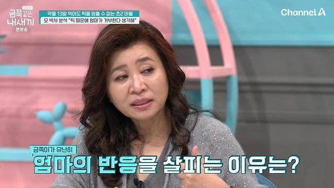 또 금쪽이는 유독 엄마의 눈치를 많이 보고, 엄마에게 예쁨 받으려고 노력하는 모습이 포착돼 눈길을 끌었다. 엄마는 "금쪽이가 틱이 시작된 후 잘 쳐다보지 않는다. 아이의 행동이 과하니까 제가 예민해지더라. 짜증내고 화를 내고 언성도 높아지니까 눈치를 보더라"라고 말했다.