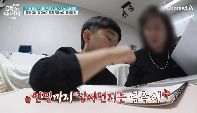 받아쓰기를 시작하자 금쪽이느 연필을 집어 던지며 거센 반응을 보였다. 그리고는 글씨를 그림처럼 그리기 시작했다. 이를 본 선생님이 단어를 다시 써 보라고 이야기하자, 갑자기 발악하며 울기 시작했고. 급기야는 "다 집에서 나가!"라고 소리치며 밖으로 뛰쳐나가려는 극단적인 행동을 보였다. 이어 금쪽이는 "내가 나가겠다"라며 주저 앉아 통곡을 해 충격을 안겼다.