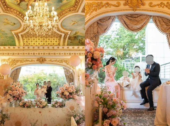 특히 사진 속에 담긴 돌잔치 공간은 마치 궁전을 연상케 하는 럭셔리한 인테리어로 눈길을 끌었다. 벽 곳곳에는 황금빛 장식이 빛나고 있었고, 커다란 샹들리에까지 럭셔리함을 뽐냈다.