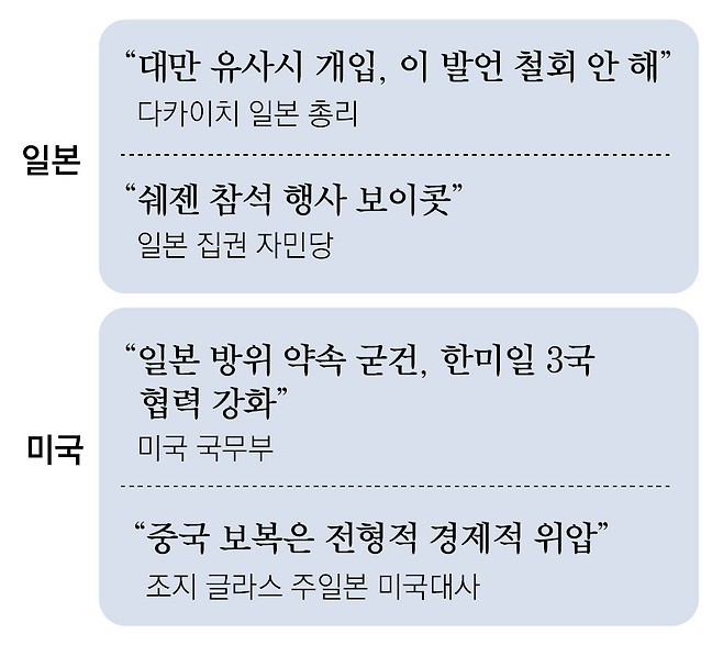 반(反)중국 성향이 강한 라이칭더(賴淸德) 대만 총통은 20일 소셜미디어에 일본 훗카이도산 가리비 초밥을 먹는 영상을 올리며 중국의 수산물 규제를 비판했다. 21일에는 일본산 수산물에 관한 모든 규제를 해제했다. 일본 집권 자민당은 쉐 총영사가 참석하는 행사를 보이콧하기로 했다.