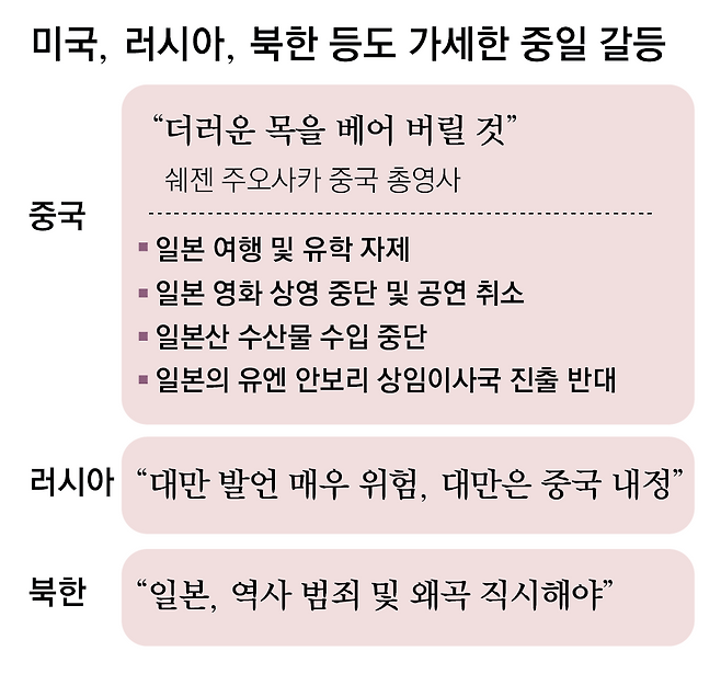 러시아, 북한 등은 중국 편에 섰다. 20일 중국 관영 중국중앙(CC)TV 등에 따르면 마리야 자하로바 러시아 외교부 대변인은 중국 측에 “다카이치 총리의 발언은 매우 위험하며 대만은 중국의 내정”이라고 중국을 두둔했다. 북한 역시 18일 “일본이 역사 범죄를 부인하고 왜곡하고 있다”고 동조했다.