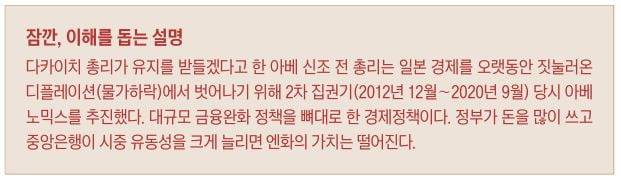 아베노믹스(재정지출 확대) 계승자를 자처한 다카이치 사나에 새 총리의 취임 이후 엔저 현상이 이어지고 있다. 10월 한 달 동안 엔·달러 환율은 147엔에서 154.1엔까지 치솟았다(엔화값 하락).