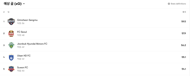 축구전문사이트 ‘풋몹’의 통계에 따르면 K리그1에서 가장 기대득점이 높은 팀은 김천으로 59.5를 기록했다. 2위가 바로 57.9의 서울이다. 우승팀 전북이 56.2로 3위를 차지했다.
