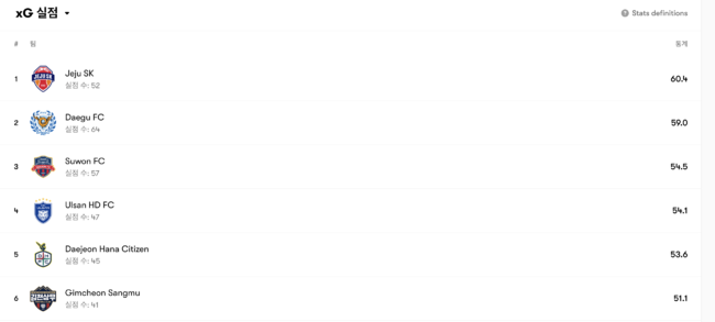 기대득점을 기준으로 가장 효율적이었던 팀은 대전 하나 시티즌이었다. 대전은 xG 52.5에서 실제 54골을 넣어 기대보다 많은 득점을 올린 팀이었다. 우승팀 전북도 기대득점 56.2를 훨씬 상회하는 62골을 넣었다.