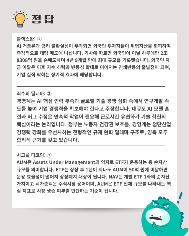 ■ ETF 시장 구조조정: 올해 상장지수펀드 순자산이 270조 원을 돌파하며 시장이 급성장했지만 소형·테마형 ETF 38개가 상장폐지되면서 양극화 현상이 뚜렷해지고 있다. 자금이 대형 운용사와 대형 상품으로 집중되면서 중소 운용사의 구조조정이 급물살을 타고 있는 상황이다.